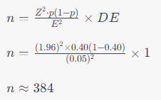 - Tentukan tingkat ketidakpastian (design effect) yang sesuai untuk desain penelitian Anda. Karena ini adalah penelitian observasional non-eksperimental dengan kelompok kategori, kita asumsikan nilai DE = 1 (tanpa efek rancangan yang kompleks).